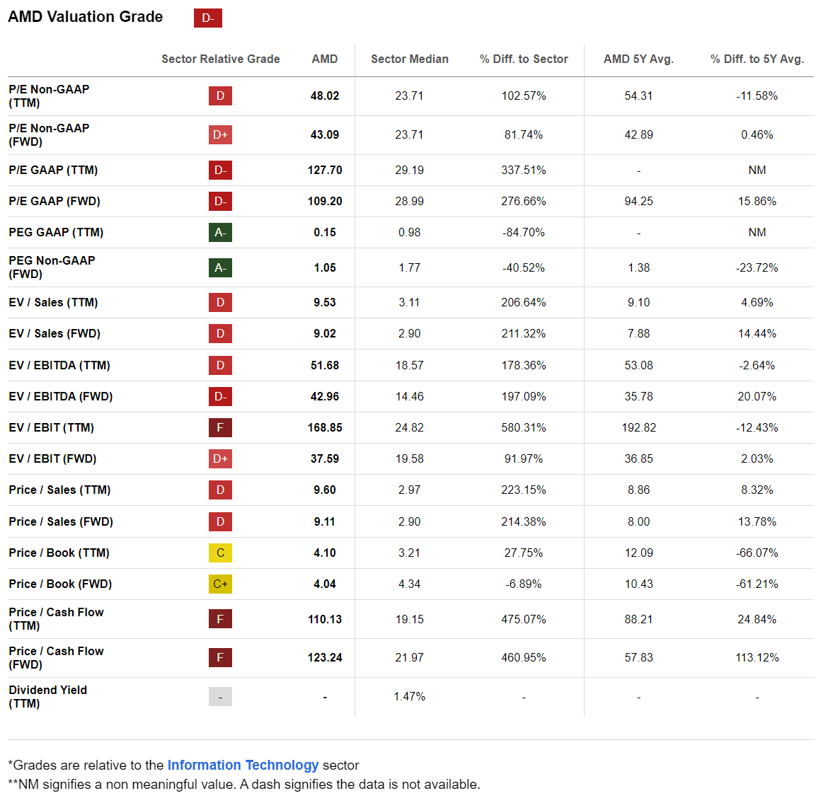 - However, AMD’s forward adjusted PEG ratio is more than 40% below its tech sector median, highlighting the market’s significant pessimism.