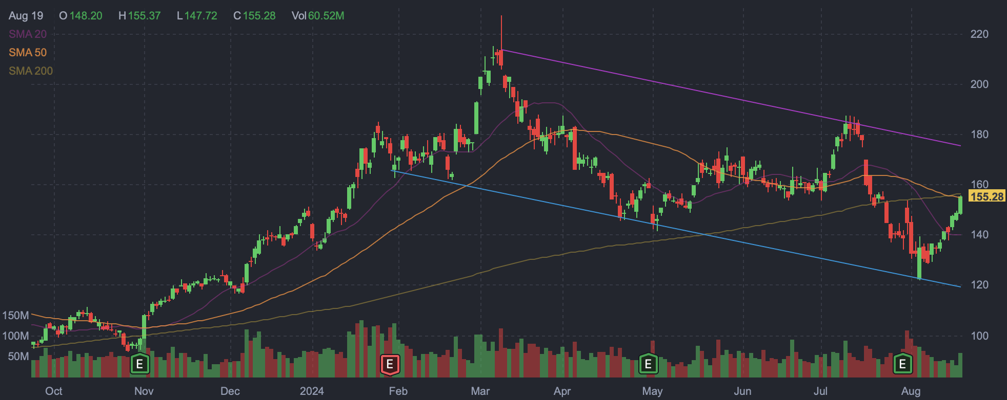 If it can break through the $150s, shares appear likely to again attempt to reach the top of the declining trading range it has been stuck in since around the start of spring of this year. The top of the range is roughly $180 per share, and AMD was there in the first half of July. At that point, it took AMD less than two weeks to make it from the $150s to above $180.