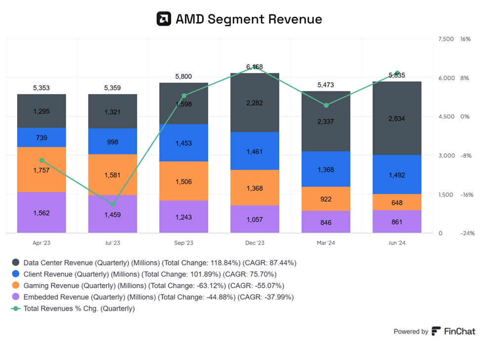 The ZT Systems acquisition was announced on August 19, 2024, in a cash/stock (75/25) deal valued at $4.9b, adding a similar benefit to AMD on the infrastructure architecture side of the business. ZT Systems is similar to Super Micro Computer (SMCI) with respect to their server rack manufacturing business, which AMD intends on carving out going into the acquisition. This move falls in line with AMD’s fabless business model in which the company is seeking to remain capital-light and continue to outsource the manufacturing capabilities. In turn, AMD intends on leveraging ZT System’s 1,000 design engineers to help design a more optimized stack for their customers. Though the acquisition may not directly be accretive to AMD’s business in the sense of generating additional revenue directly, I believe that it may passively help accelerate AMD’s growth trajectory by helping customers design a more optimized and complete system across CPUs, GPUs, networking, and server racks. From my perspective, the design team will help customers build out the schematics of the server rack for the infrastructure aggregators to manufacture and ship out to the end-customer. Management believes that this will help accelerate sales for AMD’s MI300X & MI400 series GPUs going forward. The acquisition is expected to close in 1h25 and will add an additional $150mm in opex as a result of the additional headcount. Management believes that the additional opex will be minimally dilutive to margins given the accelerated growth in GPU sales. This may also help accelerate sales of AMD’s EPYC CPU + Instinct GPU in tandem across both enterprises and hyperscalers for both training and inferencing AI/ML models.