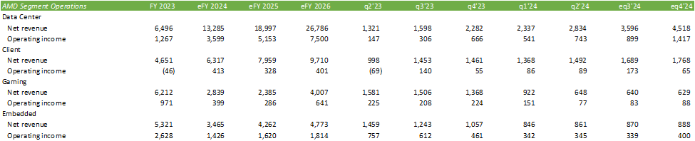 Gaming continued its downward trajectory, offsetting some of the growth driven by Data Center and Client. As suggested in my previous report covering AMD, I believe there will be a series of new console releases in the coming years that may turn this segment back to growth. Embedded was also a pull on results, with a decline of -41%. Though it is too early to tell, Silo AI may help improve growth in eFY25 for enabling smart factories and other industrial capabilities.