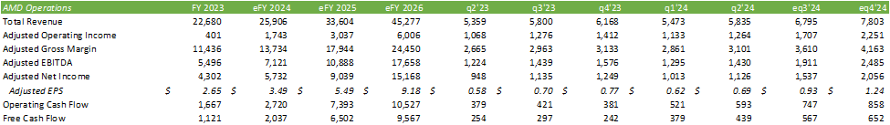 Looking to q3’24, I forecast AMD to deliver $6.75b in revenue and $0.93/share in adjusted EPS driven by significant Data Center growth and sequential improvement in Client. I forecast Gaming and Embedded to remain in flux as the two segments find their grounding. This is slightly above consensus estimates of $6.7b in revenue and $0.91/share in adjusted EPS. Given the growth backdrop and the improved supply chain, I believe AMD is well positioned to realize substantial growth as the firm expands their Instinct and EPYC offerings.