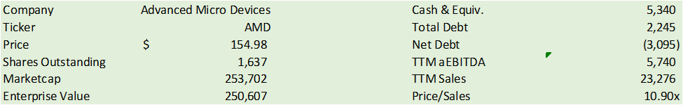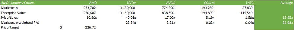 Looking at their peers, AMD appears to be undervalued, especially when considering the market cap-weighted average trading multiple of 32.92x price/sales. Taking NVDA out of the mix, this average falls to 13.45x, maintaining the discount narrative. At 13.45x price/sales, AMD shares should trade at $191/share.