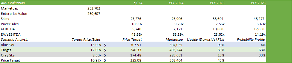 Using an internal valuation method based on historical trading premiums and the relative probability of trading at that range, I believe AMD shares should be priced at $255/share at 11x eFY25 price/sales. I reiterate my STRONG BUY recommendation for AMD shares.