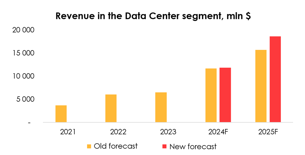 We are raising the forecast for revenue in AMD’s Data Center segment from $11.8 bln (+82% y/y) to $12.8 bln (+98% y/y) for 2024, and from $18.6 bln (+57% y/y) to $20.7 bln (+61% y/y) for 2025 as the company raised its guidance for revenue in the GPU subsegment, and also on the back of high demand for AMD equipment for data centers. We expect revenue in the Data Center segment to come to $3.59 bln in 3Q 2024.
