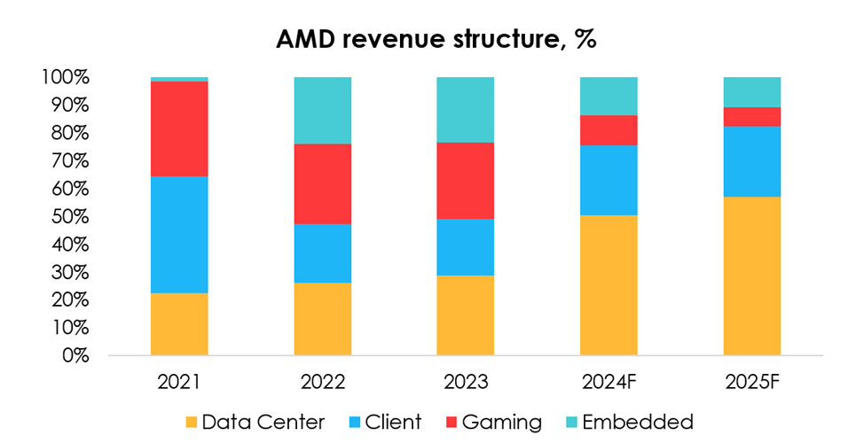 We expect that in 2024 the proportion of revenue from the Data Center segment in AMD’s total revenue will rise to 50% (+21 pp), and from the Client segment to 25% (+4 pp), given that the company’s key growth drivers continue to be in play in these two segments.