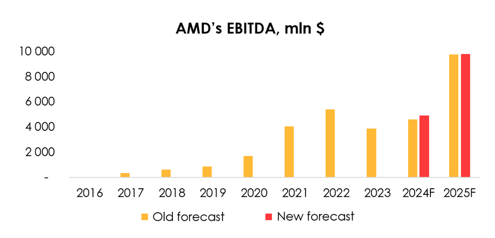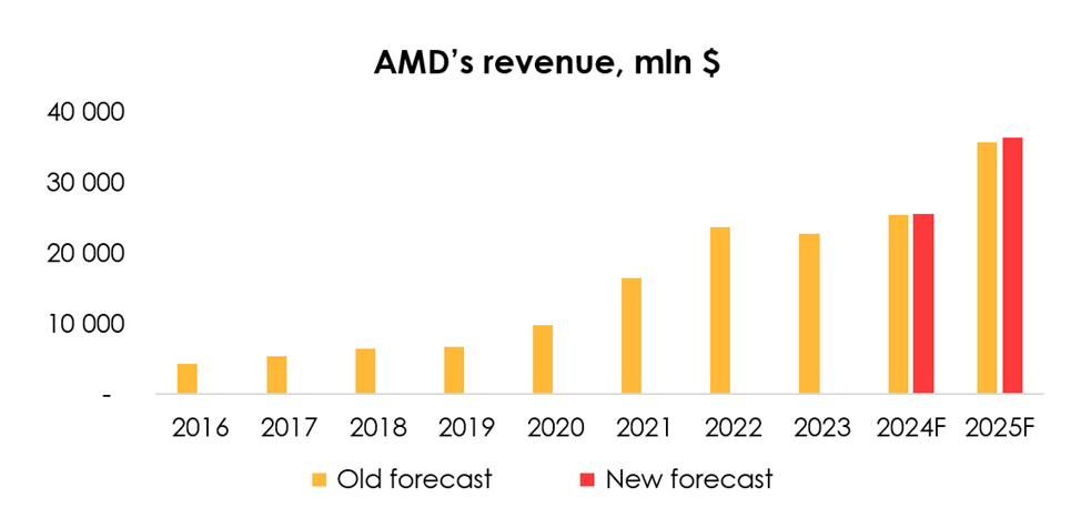 We are raising the forecast for AMD’s revenue from $25.3 bln (+12% y/y) to $25.5 bln (+12% y/y) for 2024, and from $35.7 bln (+41% y/y) to $36.3 bln (+42% y/y) for 2025, following the higher forecasts for revenue in the Data Center and Client segments, although that was partially offset by the lower forecast for the Gaming segment’s revenue.