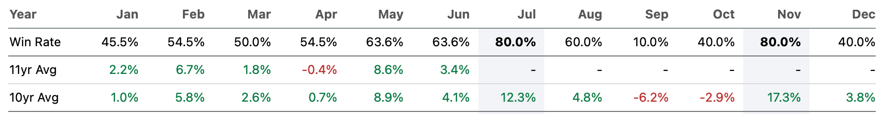 As a result, the current consolidation provides yet another opportunity to buy AMD with a margin of safety. As an additional note, July seems to be historically a strong month for the stock, based on the seasonality data from Seeking Alpha.