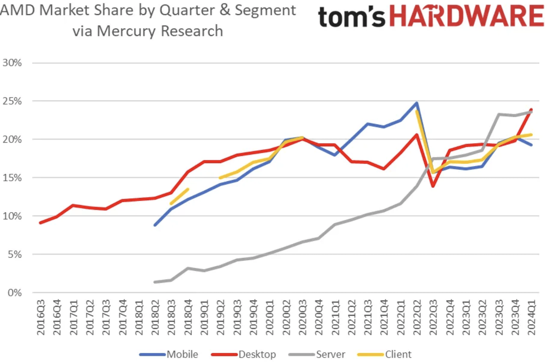 Importantly, the new Enterprise products should help AMD continue its streak of increasing Server CPU market share. In Q1 2024, the company held a 23.6% share in this market, up from 18% in the same period a year ago. The increase in market share is likely to continue in the near future, with a potential boost from the new generation of EPYC processors.