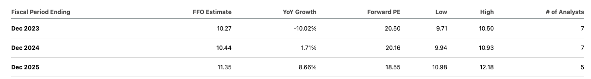 The consensus is for AMT’s FFO to be roughly flat in 2024, mainly as a result of Sprint-churn, and for 8% growth beyond. But since the REIT has a history to pushing back the 5G-related growth, which is likely to be the main growth driver, I’m going to assume a more conservative 3% annual FFO growth in my forecast.