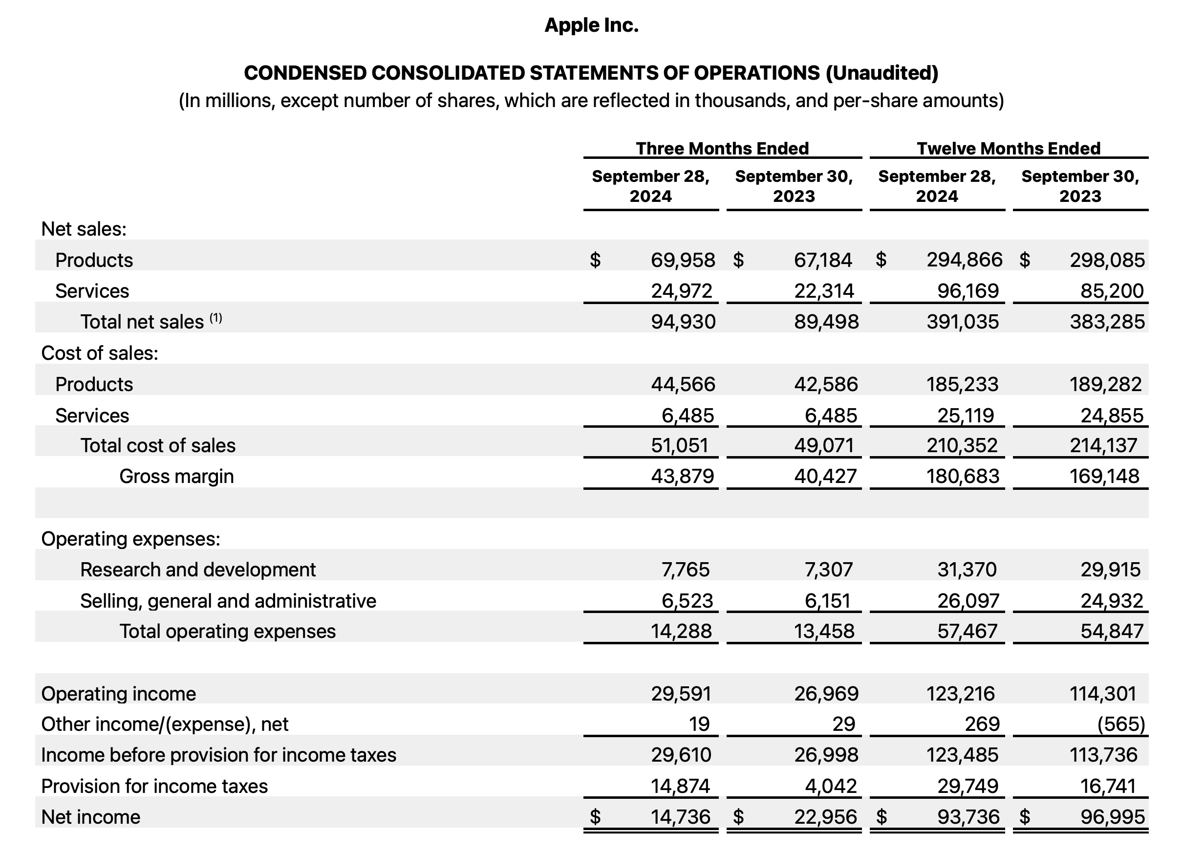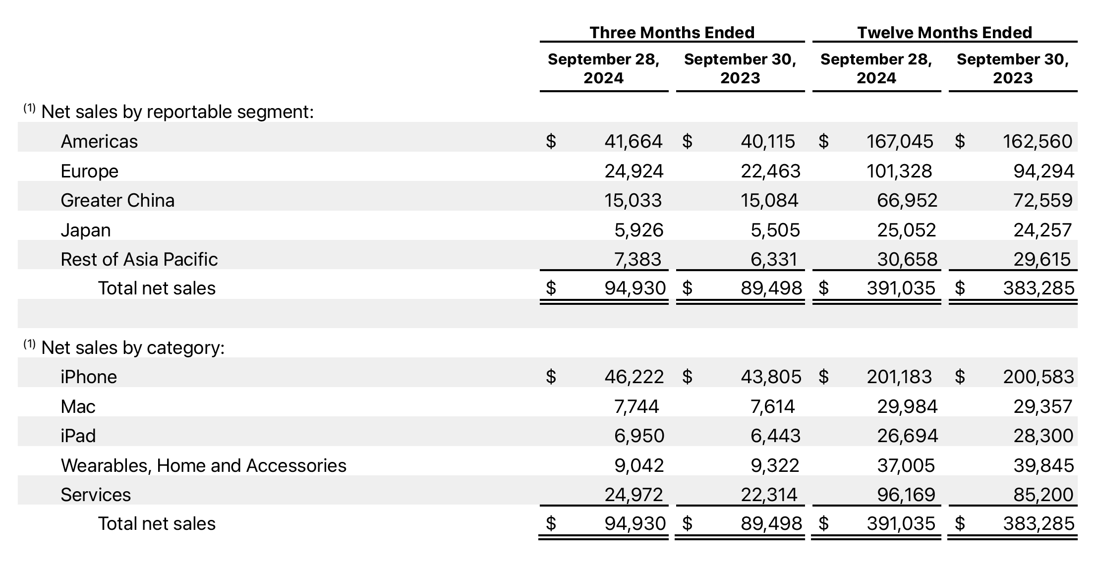 By segment, iPhone sales grew 6% year-on-year, while the Mac segment grew 2% year-on-year and the iPad segment also grew 8% year-on-year. The only segment that showed a slowdown/decline seems to be wearables, although positive prospects may be on the horizon with the launch of AirPods 4 and Apple Watch 10 in late September. On the other hand, we see that the launch of the Vision Pro earlier this year apparently did not contribute substantially enough to offset the slowdown among the other products in the segment.