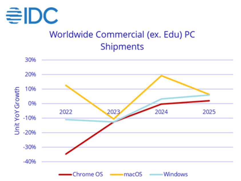 Although last year IDC had estimated that the number of MacOS-based devices for enterprise use across the world would grow by 20% between 2023 and 2024, as per IDC’s Worldwide Commercial PC Shipments chart below.