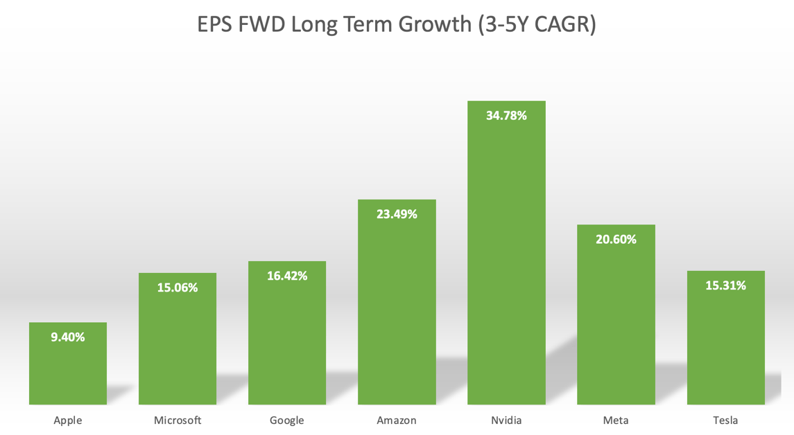 The chart below compares the EPS FWD Long Term Growth (3-5Y CAGR) of Apple stock against the other Magnificent 7 stocks.