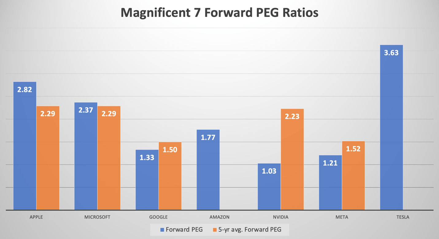 However, most of the other Magnificent 7 tech stocks are either trading roughly in-line or well below their 5-year average Forward PEG multiples, despite the promise of AI-driven growth.
