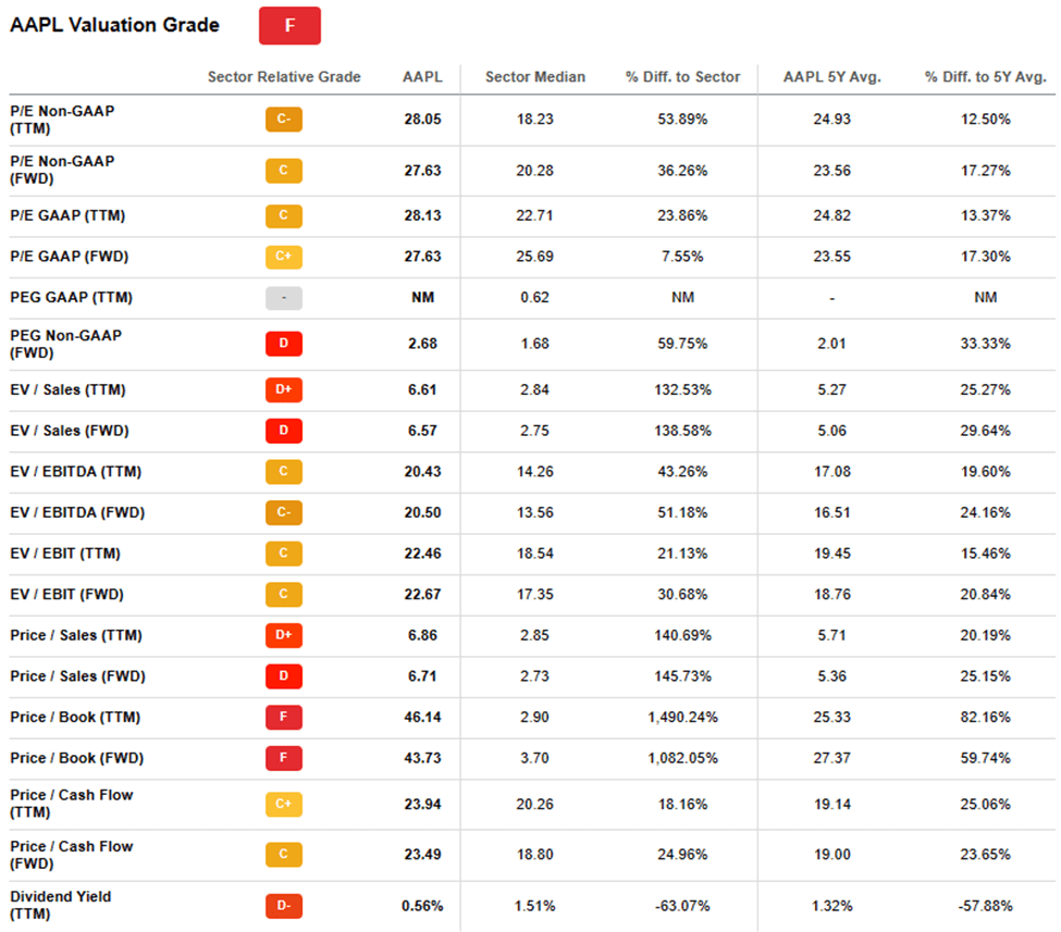 Seeking Alpha’s Quant has assigned Apple with an “F” valuation rating. Unfortunately, I am still inclined to agree with this assessment as it represents a fair evaluation of Apple’s current share price when considered against traditional valuation metrics.
