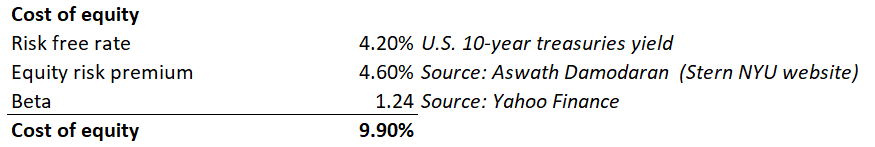 Thus, future growth potential must be considered in determining the stock’s intrinsic value. The discounted cash flow (DCF) approach helps to solve this problem. Apple’s total debt is $100 billion, which is almost nothing when compared to a $3.5 trillion market cap. Therefore, using cost of equity instead of WACC looks like a fair option. The cost of equity is 9.9% and calculations are outlined in the below working.