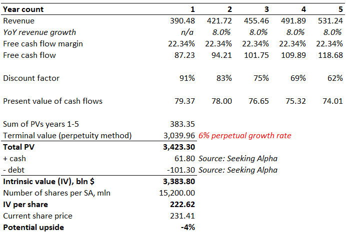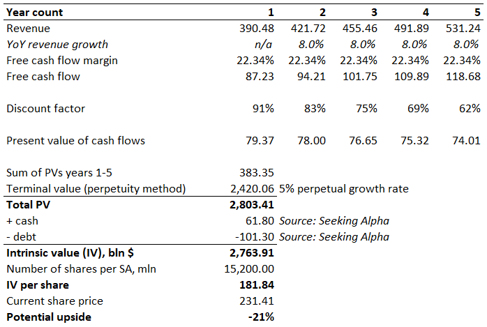 According to consensus, revenue growth is expected to accelerate from single digits to 12.6% in FY2027. I consider this as a risky assumption due to secular issues I have described above. Therefore, I take an 8% “rule of thumb” revenue CAGR for my DCF because it aligns with consensus projections for the next two fiscal years (a sample of more than 40 Wall Street analysts). The levered FCF margin is 22.34%. I expect it to remain flat due to the aforementioned secular issues. To balance out my cautious stance for years 1-5, I am factoring in an optimistic 5% perpetual growth rate. The intrinsic value (IV) per share is close to $182, 21% lower than the current share price.