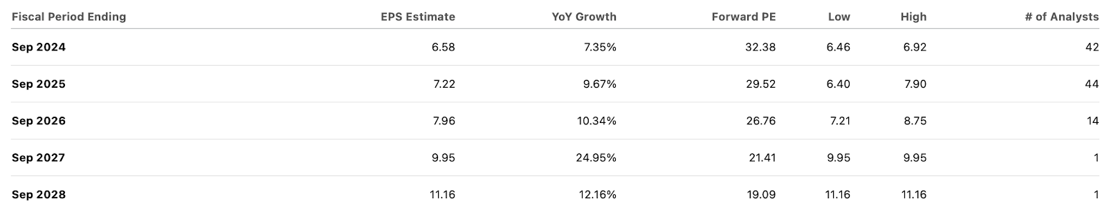 This has been a tumultuous quarter for the stock. First there was news of Warren Buffet’s Berkshire Hathaway (BRK.B) cutting their stake in the company. Then the ongoing DOJ lawsuit revealed that Alphabet (GOOGL) has been paying around $20 billion annually to be the default search engine in Safari. For reference, the company generated around $97 billion in GAAP net income in the last fiscal year. But these items all pale in comparison to what really matters. AAPL revealed a slate of planned upgrades, including generative AI capabilities in the next batch of iPhones. I think it’s fair to say that most investors must have known this was inevitable, but the timing has been confirmed. I see some important takeaways here. First, AAPL’s decision to work with OpenAI to enhance Siri might indicate a potential new competitor for search in the future – perhaps alleviating the assumed risk to the $20 billion payout from GOOGL. Generative AI enabled iPhones is arguably something that is worth upgrading for, and isn’t the typical “incremental improvement” that Apple lovers (and skeptics) have grown used to. AAPL generated around $200 billion in iPhone sales annually over the last two years. Assuming a 20% jump and 60% gross margins, AAPL might see as much as a $1.50 per share boost to earnings estimates over the next year. That might imply the company may earn around $8.72 in EPS in fiscal 2025, with the stock trading at 25x those estimates.