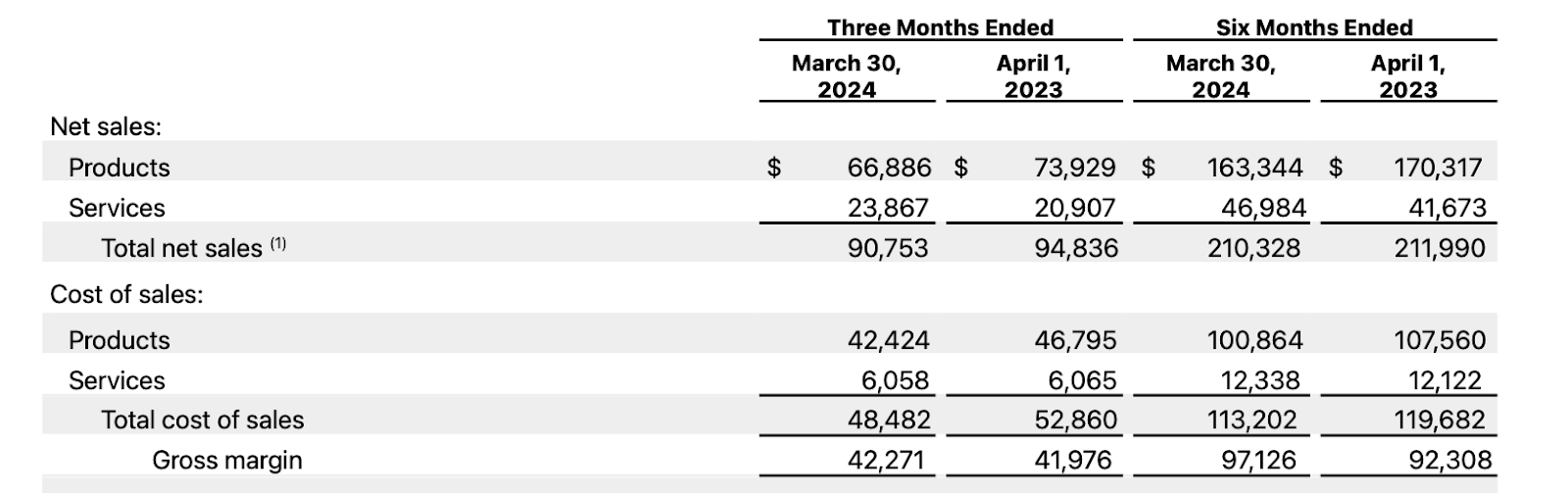 In its most recent quarter, AAPL delivered financial results which need some perspective. Revenues declined by 4% YoY, with gross profits rising slightly YoY due to increasing contribution from high margin services revenues.