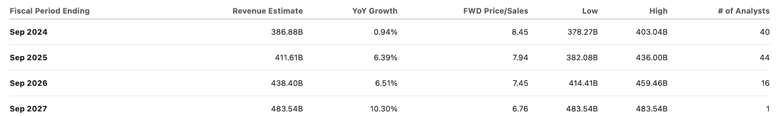 Then looking beyond just the near term, AAPL might be able to sustain higher profit margins from iPhone sales due to a higher end mix, as well as see an acceleration in services revenue growth. It is notable that AAPL might not see the same deterioration in margins reported by cloud companies due to generative AI, as that burden might fall into the app-creators. These suggest that consensus estimates for high single-digit top line growth over the coming years looks achievable at the very least.
