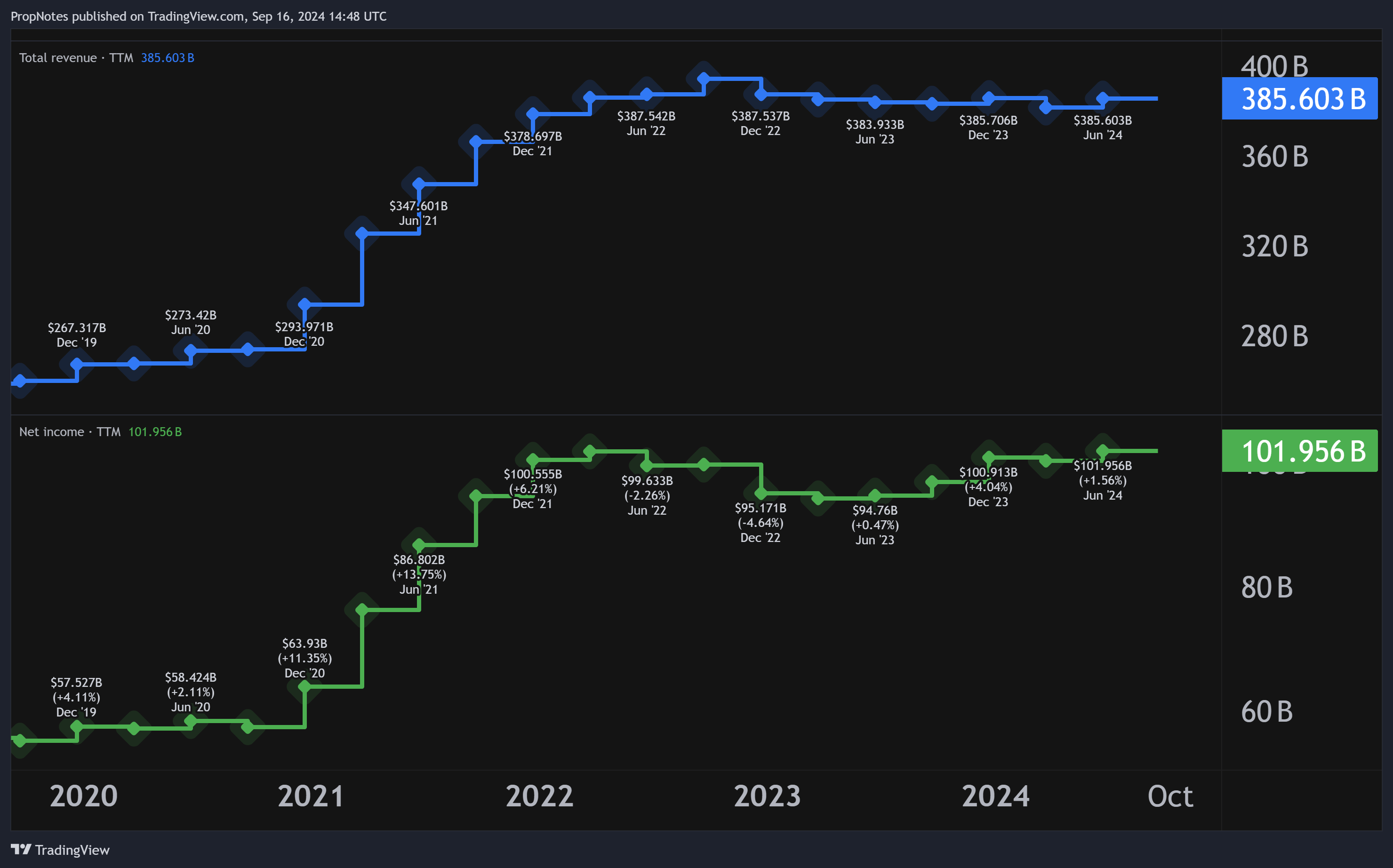 From the top down, AAPL’s revenues and net income have grown considerably from 2020 through today, which is a result of several new iPhone launches, new chips, and growth in AAPL services: