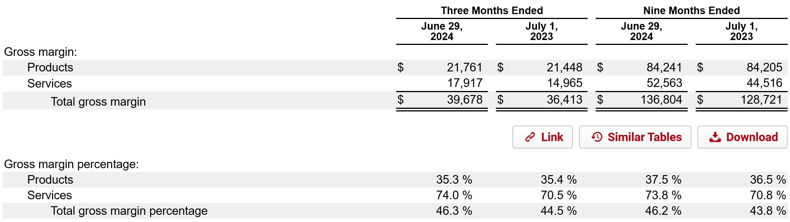 Last quarter, AAPL’s services segment sported margins of 74% vs. 35% for hardware products, which is a significant gap. This margin also increased YoY by more than 400 basis points, which is considerable. Product margins stayed flat.