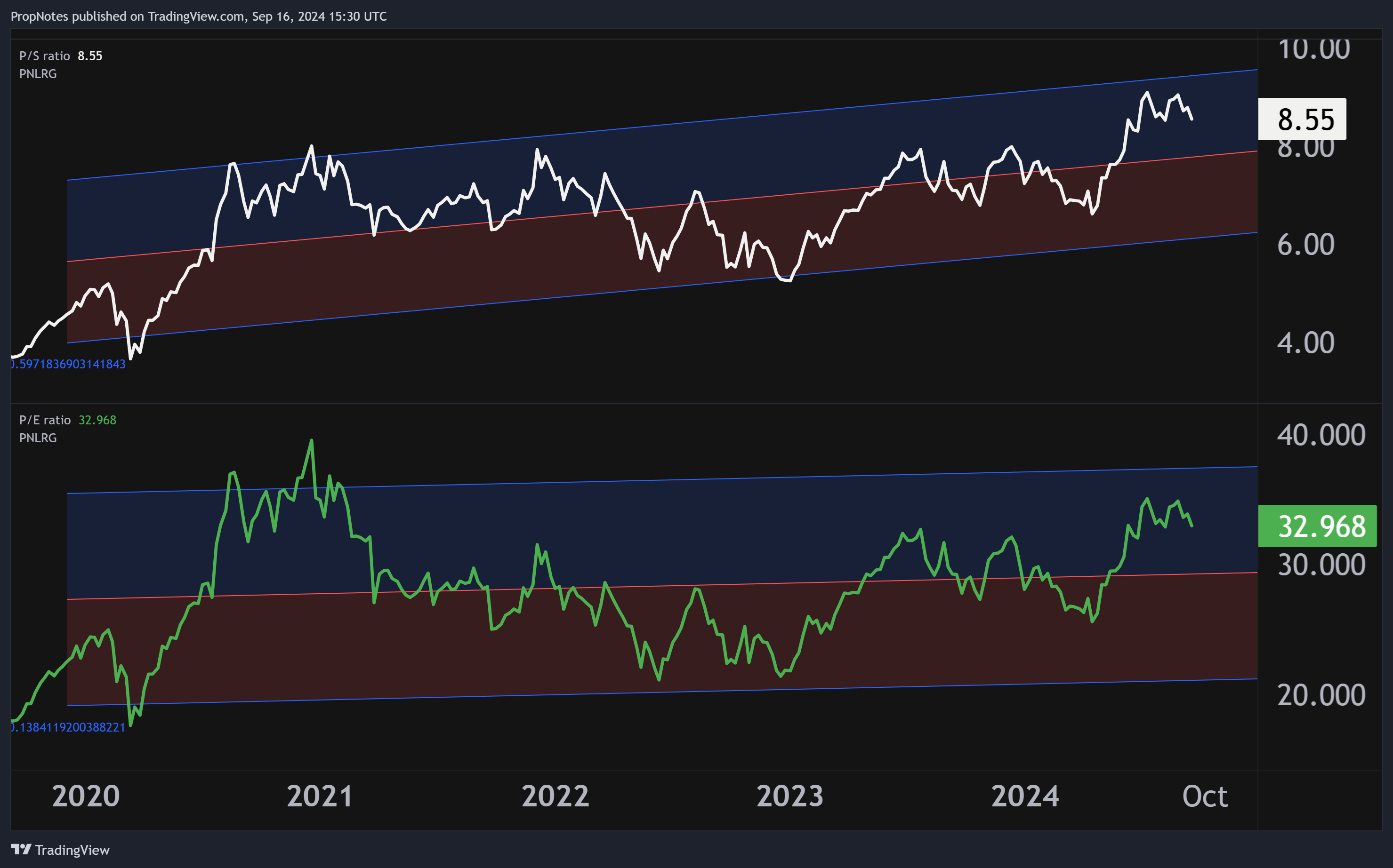 At the same time, the stock is more richly valued than almost ever before, trading at nearly 9x sales and 33x net income, which is basically at the top end of the range.