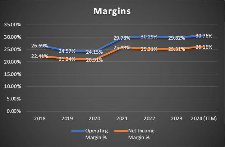 Margins have also improved notably. The operating margin rose from 29.82% in Q4 2023 to 30.76%, while net income increased from 25.31% to 26.16%.