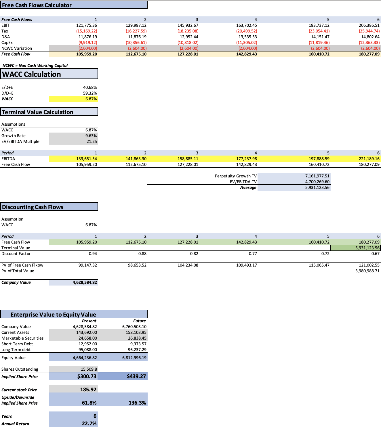 This model appears more optimistic than the previous one, as it suggests a fair price of around $300.73, indicating a 61.8% upside from the current stock price. The model indicates that by 2029, the stock should reach a price of $439.27, translating into annual returns of 22.7%.