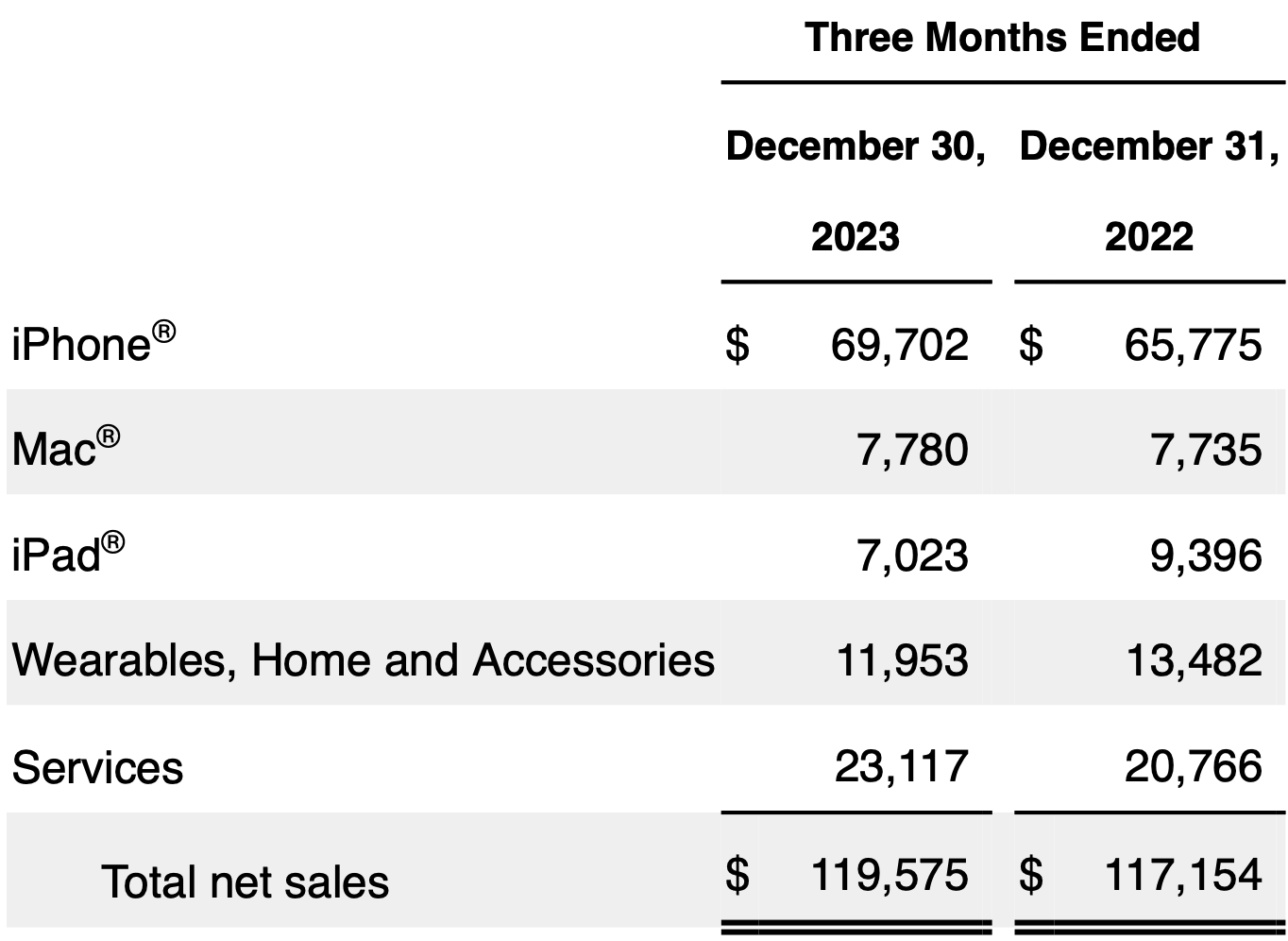 Accessories have decreased by 11.31% from the same quarter a year ago. Nevertheless in FY2023, accessories displayed a decrease of 3% similar to the decrease displayed by iPhone and iPad of 2 and 3% respectively. This showcases that the vast majority of Apple buyers, buy their accessories directly from Apple (like covers). Therefore, in the valuation section I will make this segment grow at the same pace as device sales.