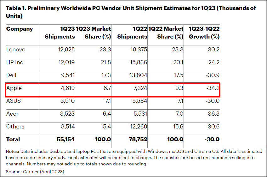 - Weakness in PC shipments represents a headwind for Apple’s product revenue growth.