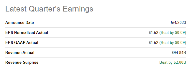 Apple reported strong results, with both earnings and revenues coming in above estimates for the second fiscal quarter. Apple reported EPS of $1.52 per-share, beating the average estimate by $0.09 per-share. Apple’s FQ2’23 revenues were $94.9B which beat estimates by $2.0B.