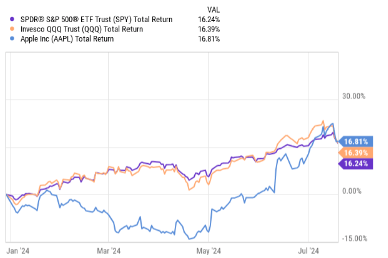 - Since then Apple has delivered similar returns to the market, which were primarily driven by the massive share buyback program and AI potential.