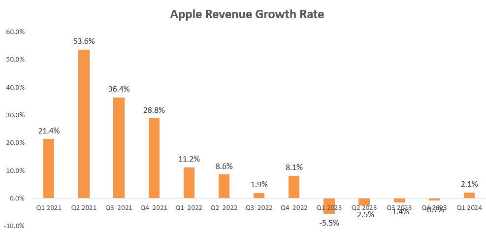 Apple’s main risk lies in its China operations, where the Great China business contributes approximately 19% of the group’s revenue. Several analysts queried about their China business during the earnings call. Unfortunately, their Great China revenue witnessed a decline of 12.9% in Q1 FY24, with iPhone revenue dropping in the mid-single digits in China. Adding to the challenges, Huawei launched its Mate 60 Pro last August, heightening competition in the premium smartphone market.