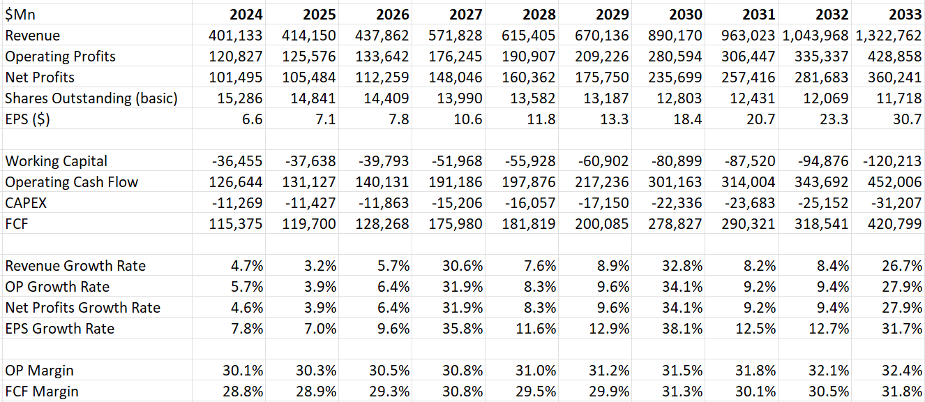 I am incorporating Apple Vision Pro’s revenue into the valuation model, assuming Apple can sell 0.5 million units in FY24, and then gradually ramp up to 20 million in ten years. Compared to the trajectory of the Apple Watch, I believe this is a reasonable assumption for Apple Vision Pro.
