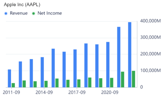 I decided to have a look at Apple’s annual revenues and its net earnings history first. Particularly good in terms of sales and profits seem to be the last two years, namely 2022 and 2021. Compared to the 2020-2022 period the company showed moderate, yet very steady growth. In my view, the recent couple of years of substantial growth was largely due to the large amounts of money printed by the leading central banks all over the world, most notably the Fed and the ECB, to support the aggregate demand in their economies. Some of the money was also distributed among the citizens as unemployment benefits and other forms of social welfare, which also enabled many people to buy various consumer goods, including iPhones.