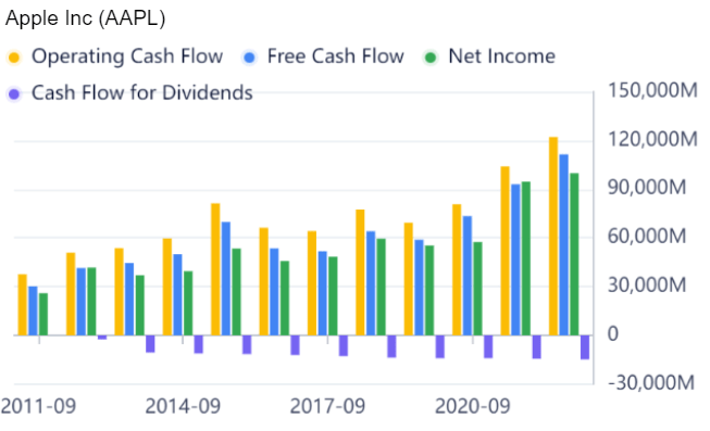 The good thing for Apple is its growing operating cash flow. It was over $122 billion in 2022. The steady growth trend also inspires optimism.