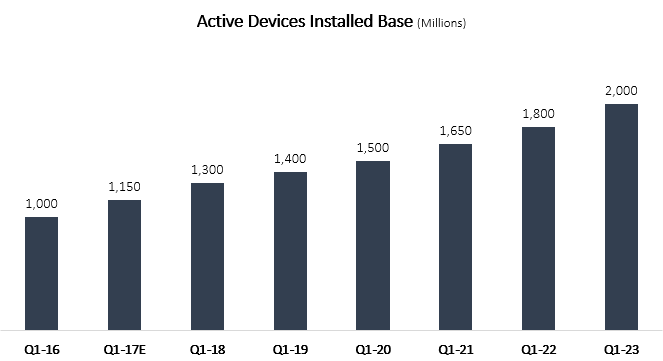 • Behind the noise, lies Apple’s unstoppable ecosystem business model, standing on the foundation of 2 billion active devices installed base which doubled in 7 years.