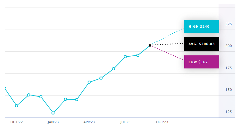 Much like the varying opinions found on Seeking Alpha, professional analysts also have a wide range of predictions when it comes to Apple’s price targets. Among the 38 analysts offering 12-month price forecasts, the median target is set at $206.8. Within this range, there’s a high projection of $240.00 and a low estimate of $167.00. It’s noteworthy that the median estimate suggests a notable +14.46% increase from the stock’s most recent price of $174.74.
