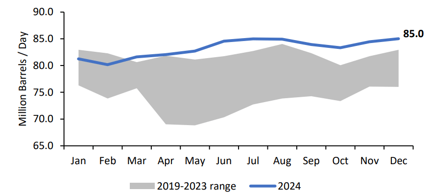 The demand for transportation has increased, with this year’s barrels-per-day being run from refineries exceeding the upper bounds of the last five years’ range, indicating increased demand from before.
