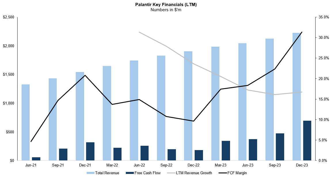 Palantir generated a record $697m in FCF LTM Dec-23 (FCF defined as reported Cash from Operations less Capex), a 31% margin. The company has executed well on the margins side (for reference, just a year ago LTM FCF margins were less than 10%), but I believe it is pretty much optimized for FCF generation. If Palantir keeps executing, I think it could reach steady FCF margins of ~35%, a modest expansion from current levels.