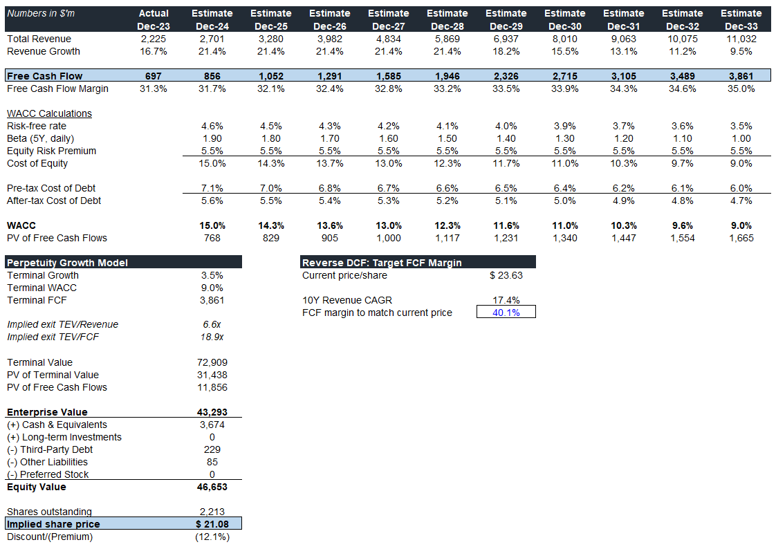 Under these assumptions (low 20%s growth, ~35% FCF margins), I see Palantir generating ~$3.9bn in FCF in 10 years-time, vs $697m LTM (+19% 10Y FCF CAGR). At this stage, I believe Palantir is a $20-$21/share company. From a reverse DCF perspective, if Palantir maintains around a 17% 10Y revenue growth, the company would need ~40% FCF margins to justify the current price, which I think is aggressive but not impossible.