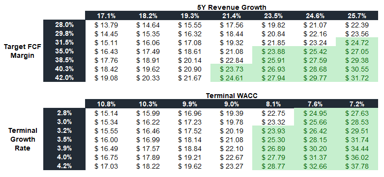 Here’s what fair value sensitivities look like (fair values > current share price highlighted in green):