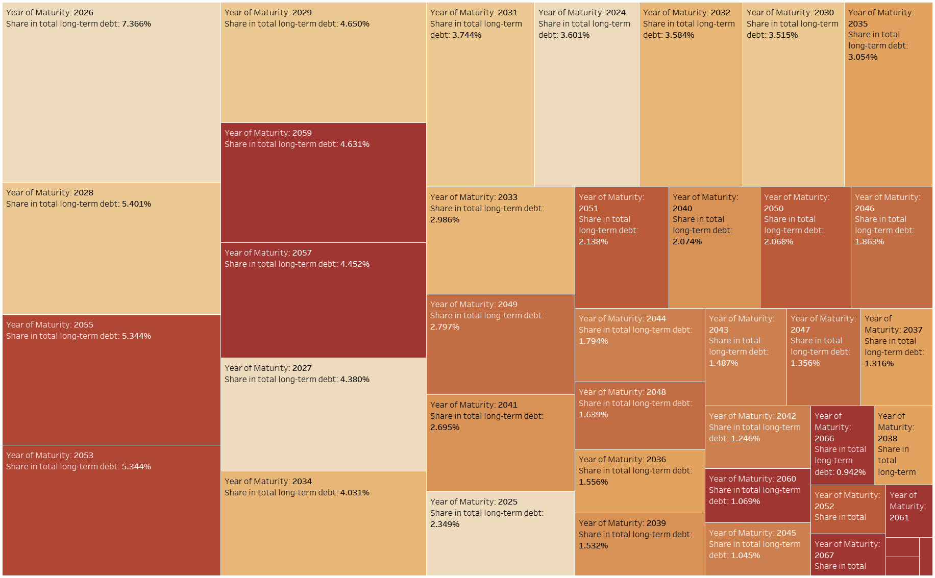 For AT&T’s fixed rate debt, we can get a first impression of its composition by drawing a tree map where the size of the rectangle indicates the share in total debt by year.