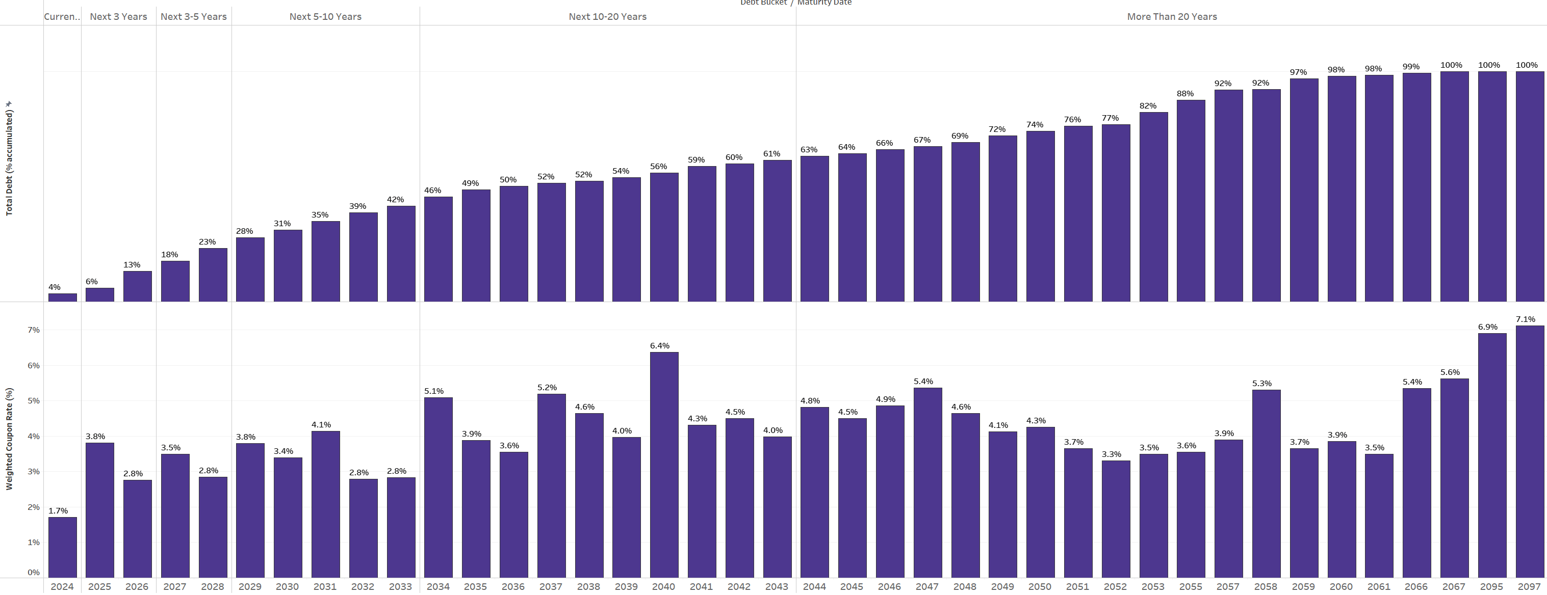 When visualizing this data through a cumulative calculation, we observe that within the upcoming five years (2024 to 2028), approximately 23% of the total fixed long-term debt is set to mature.