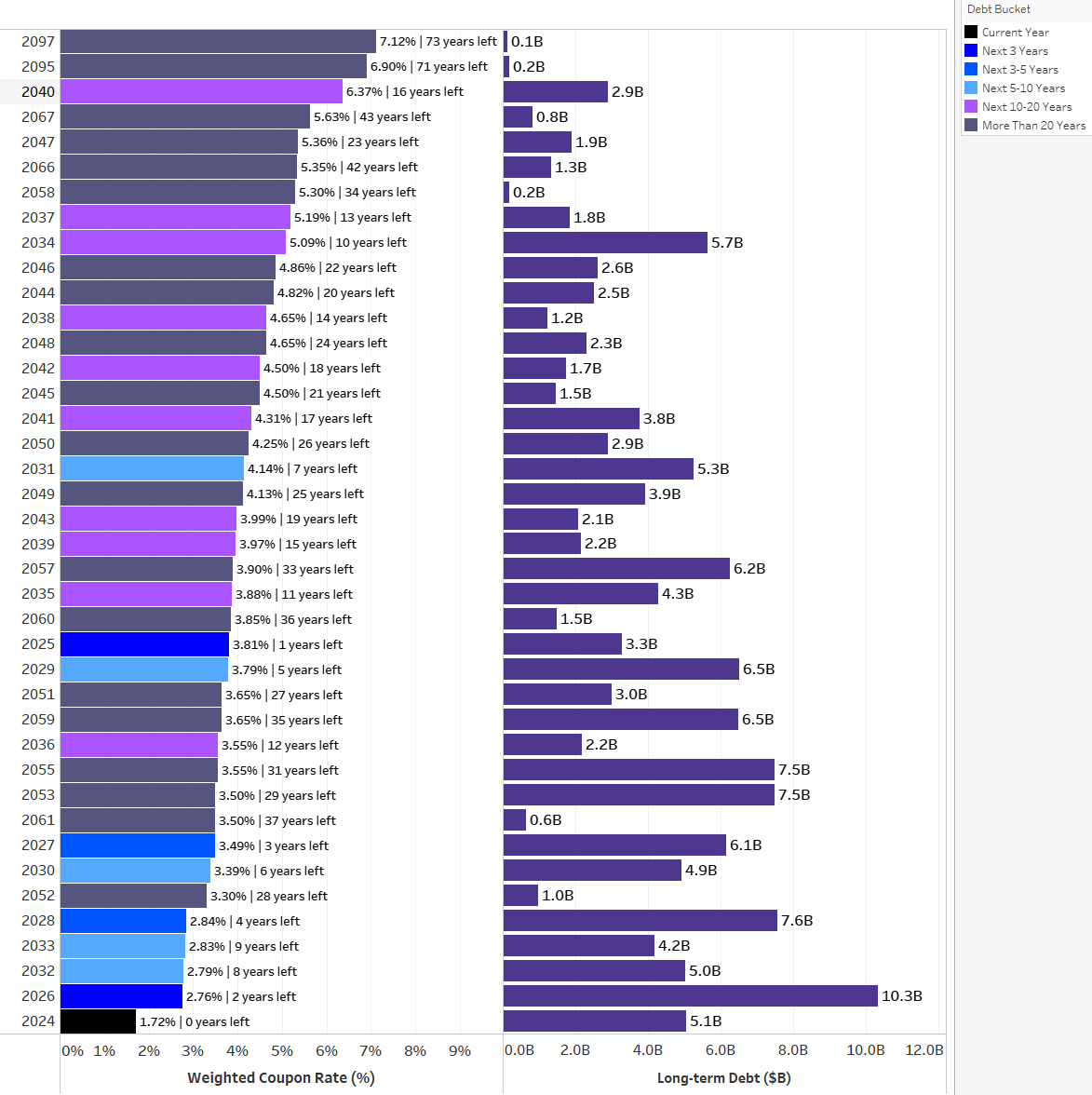 Looking ahead, 14% of the debt is set to mature within 5-10 years, while an additional 15% falls due within 10-20 years. This totals to 61% of the total debt due within the next 20 years. Notably, a significant portion of outstanding debt extends from 2044 to 2097, a period so distant that its implications are uncertain. Given the potential for transformative technological advancements driven by AI in the coming decades, predicting the landscape of companies and their roles becomes exponentially uncertain and futile.