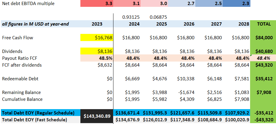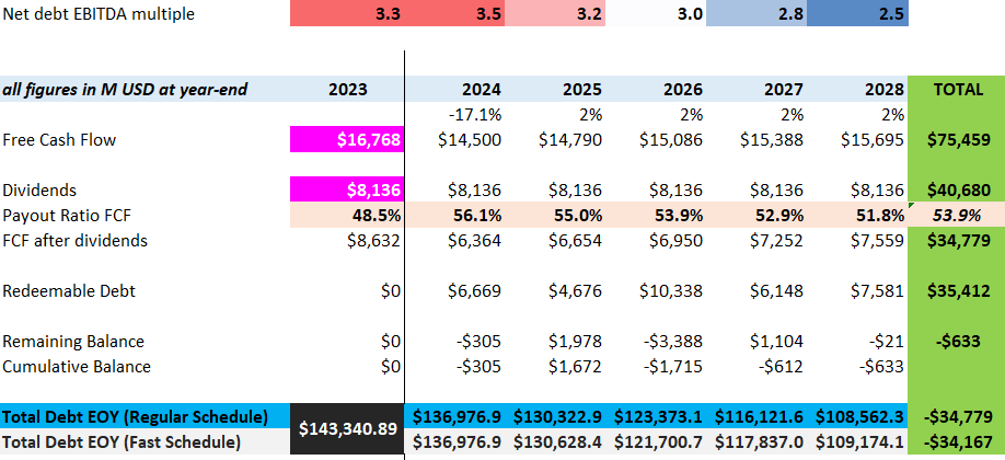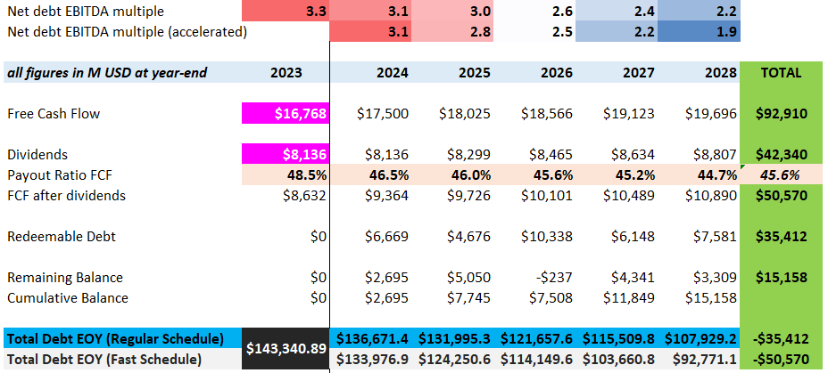 We are projecting moderate annual growth of 3% for both EBITDA and FCF over the next five years, along with a 2% dividend growth rate. With these assumptions, the projected 5-year FCF after dividends amounts to an impressive $50.5 billion. This figure significantly exceeds the redeemable debt obligations of “only” $35.4 billion.