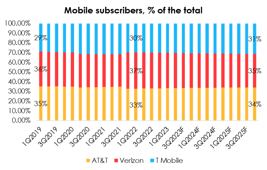 With churn rates remaining low, the significant slowdown wasn’t due to increased competition in our view, but rather because the telecom industry has reached saturation. Currently, the three largest operators (AT&T, Verizon (VZ) and T-Mobile (TMUS)) account for nearly 312 million lines, or 94% of the US population, according to internal company data and World Bank statistics. These numbers were 92.3% and 83.4% at the end of 2020 and 2021, respectively.