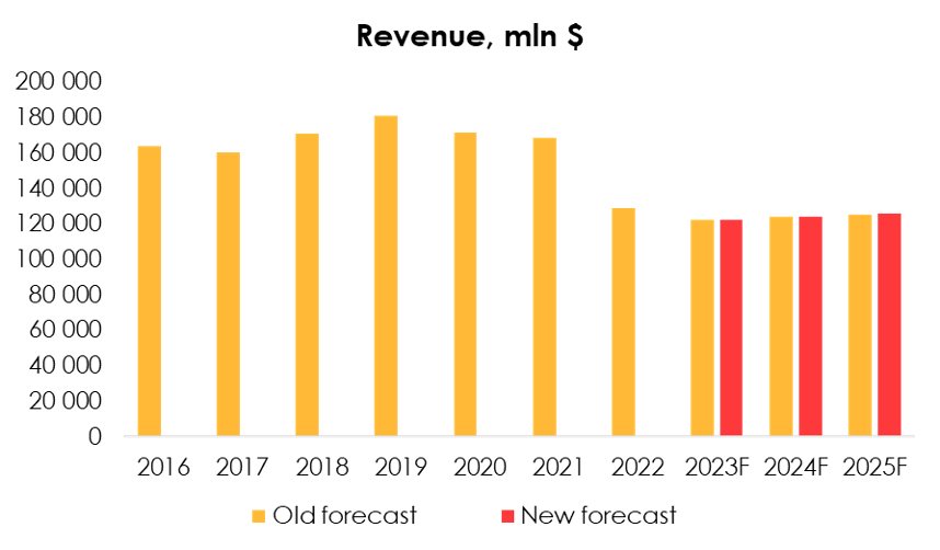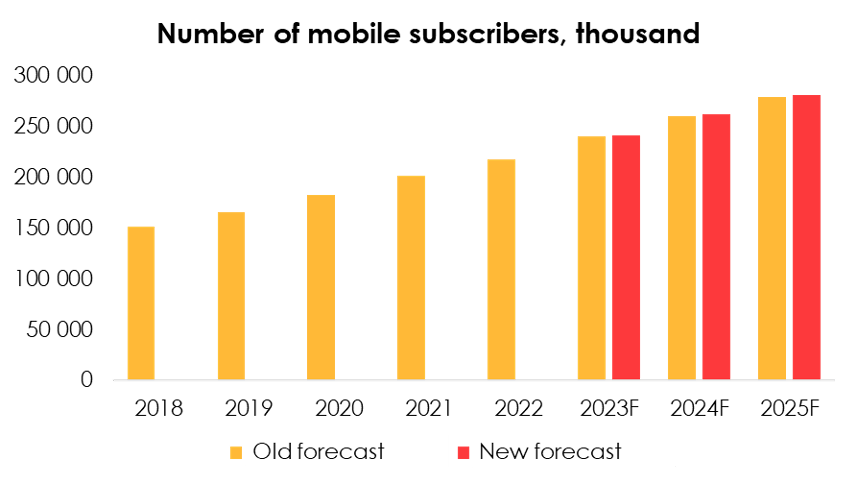 However, we see that the growth of subscribers in the segment of IoT devices is outpacing expectations, with the number of subscribers reaching 117.2 mln (+21.9% y/y) in 2Q, compared with the forecast of 114 mln. Given that the growth rate of the segment beat expectations, we are raising the forecast for the number of subscribers from 240.2 mln (+10.5% y/y) to 241.8 mln (11.2% y/y) for 2023, and from 260.4 mln (+8.4% y/y) to 262.5 mln (+8.6% y/y) for 2024.