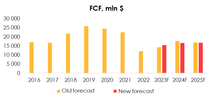 Free cash flow ,significantly surpassed our expectations in 2Q, reaching $4.2 bln (+209% y/y), up from the forecast of $1.7 bln. That kind of cash generation was largely driven by the company’s use of the deferred tax option, making it highly likely that AT&T will meet its guidance for a FCF of $16 bln in 2023. For valuation purposes, we have projected that tax liabilities will be paid in equal parts throughout the year, starting from 2Q 2024. As such, we are raising the FCF forecast from $14,285 mln (+18.5% y/y) to $15,485 mln (+28.4% y/y) for 2023 and lowering it for 2024 from $17,753 mln (+24.3% y/y) to $16,585 mln (+7.1% y/y).