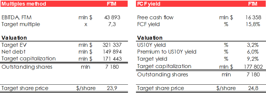 We’re evaluating AT&T prices based on FTM EV/EBITDA multiples and FCF Yield. We are raising the target price of the shares from $23.2 to $24.3 due to: